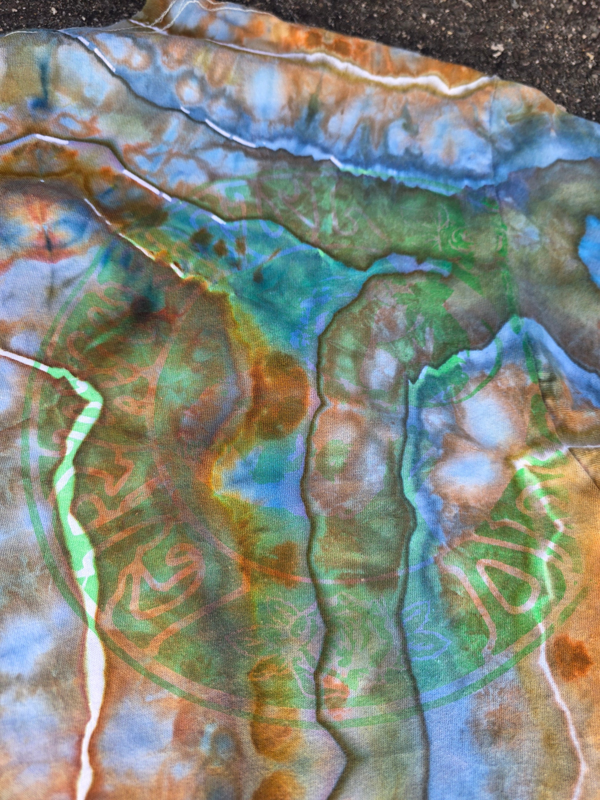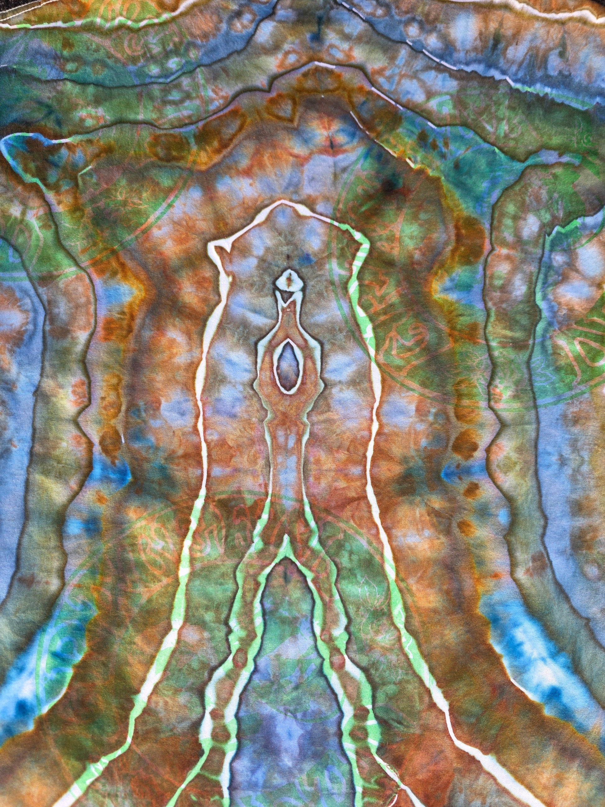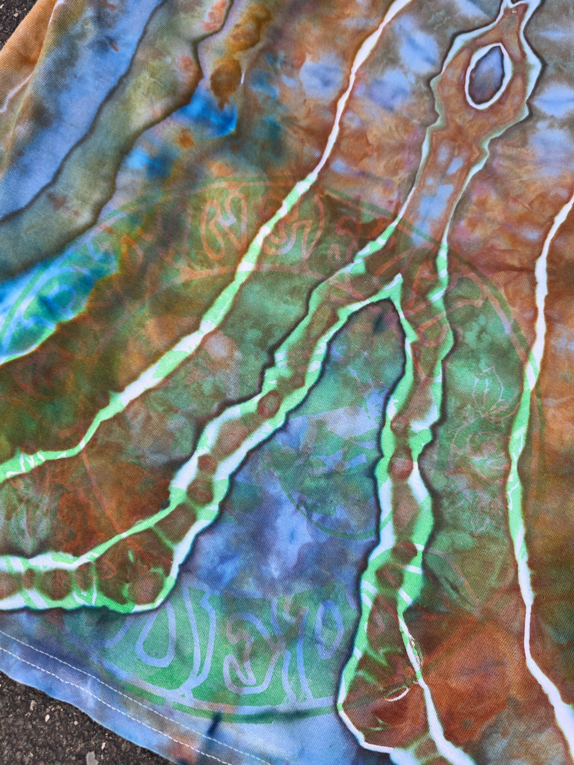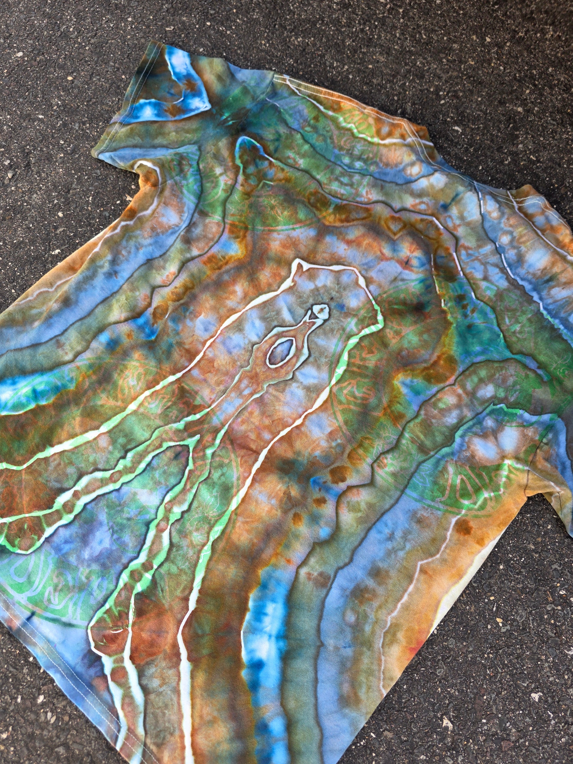 This item is an XL, 100% cotton, Liquid Blue Brand tee, upcycled and screen-printed by SnakebootzVTG and then dyed by me in a mix of earthy reds, browns, and blues. The back features "hidden" green GD images.